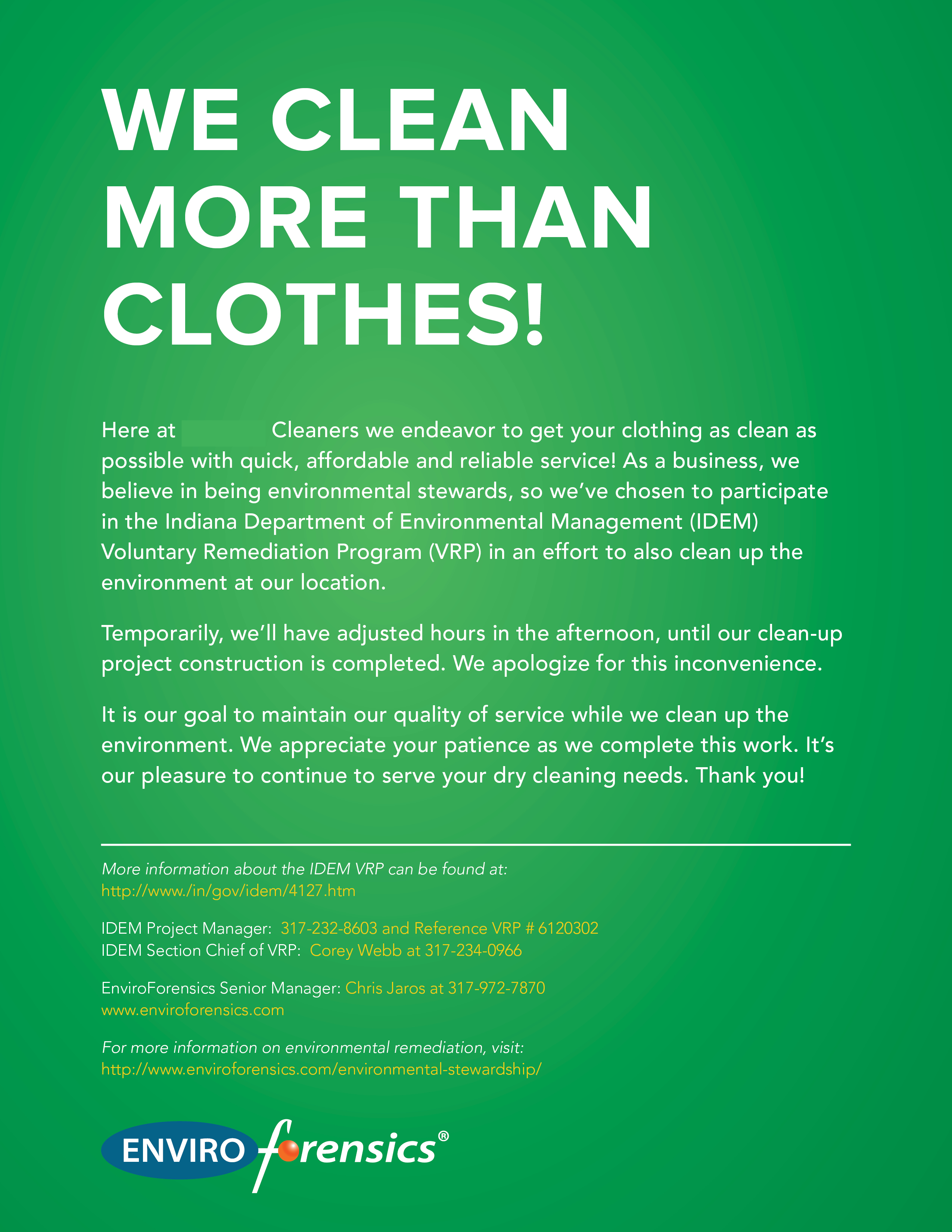 This poster is prominently displayed outside the actual drycleaner. It was put up to help maintain transparency between the business and its loyal customers as well as establish the drycleaner owners as stewards for the environment.